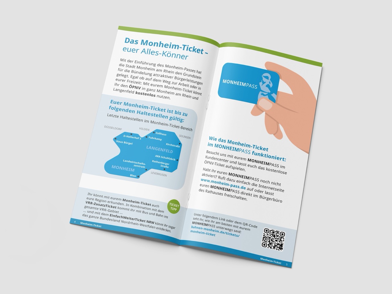 Die neu konzipierte Tarifbroschüre, die die Kundenbedürfnisse in den Mittelpunkt stellt, stieß in der ersten Auflage auf große Nachfrage. Bereits nach wenigen Monaten wurde eine überarbeitete Auflage gedruckt. Durch regelmäßige Aktualisierungen und die Integration von Kundenfeedback entwickelt sich das Medium kontinuierlich weiter und hat sich zum Leitmedium der Bahnen der Stadt Monheim etabliert.