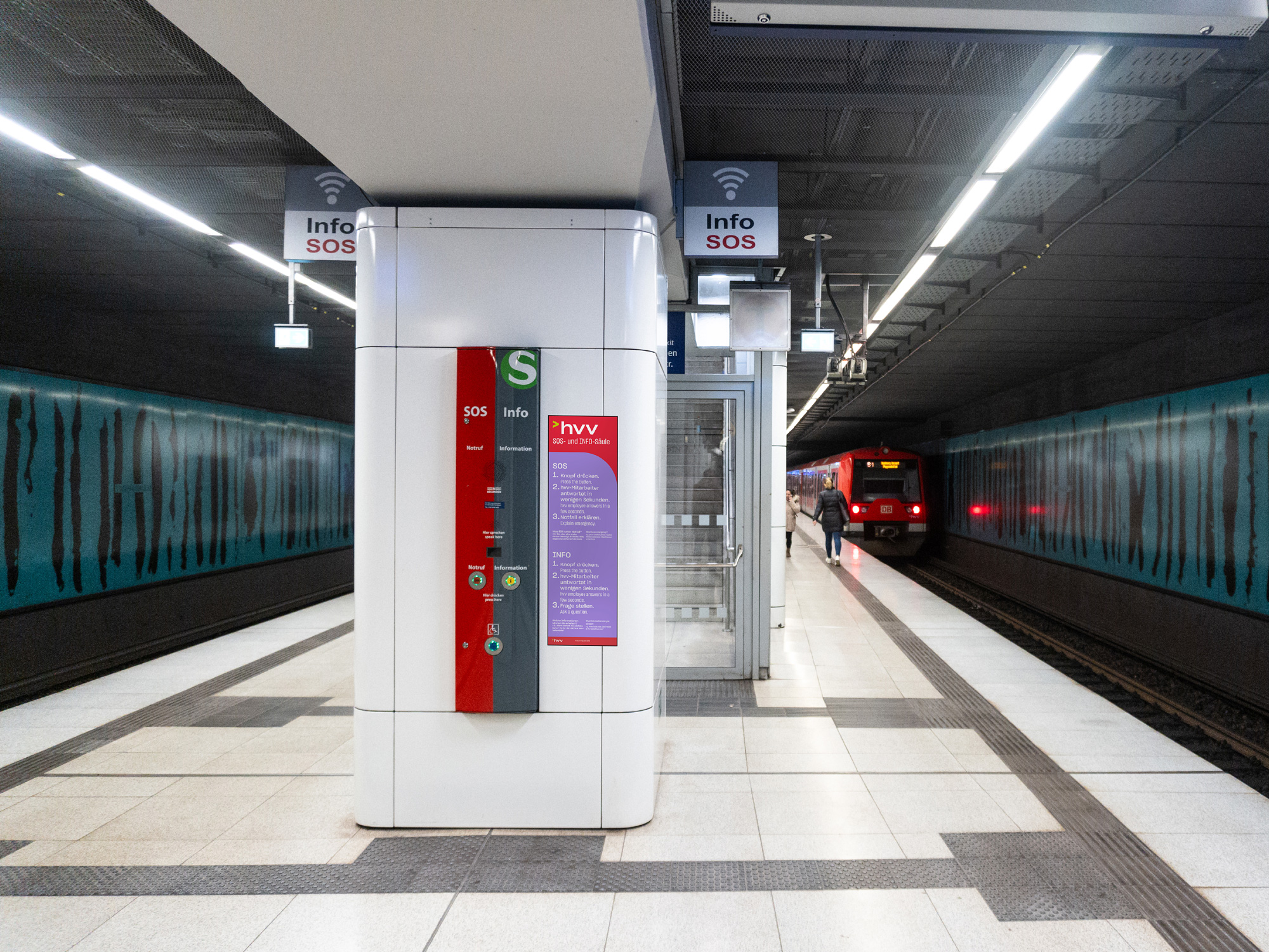 Im Rahmen des Fahrgast-Beteiligungsformates des hvv – OpenHVV – wurde das Ziel verfolgt, bestehende Notrufsäulen im HVV-Gebiet verständlicher und zugänglicher zu gestalten. In der ersten Phase wurde ein Prototyp zur Vertestung entwickelt. Hierfür wurde zum einen eine neues Erklär-Medium geschaffen und zum anderen Richtungsweiser, die an die bestehende Umgebung angepasst sind. So sind die Notrufsäulen prominenter ausgeschildert, Nutzungsschritte visuell vereinfacht und Unsicherheiten reduziert. Die Gestaltung stärkt damit Sicherheit und Handlungsfähigkeit im Ernstfall.