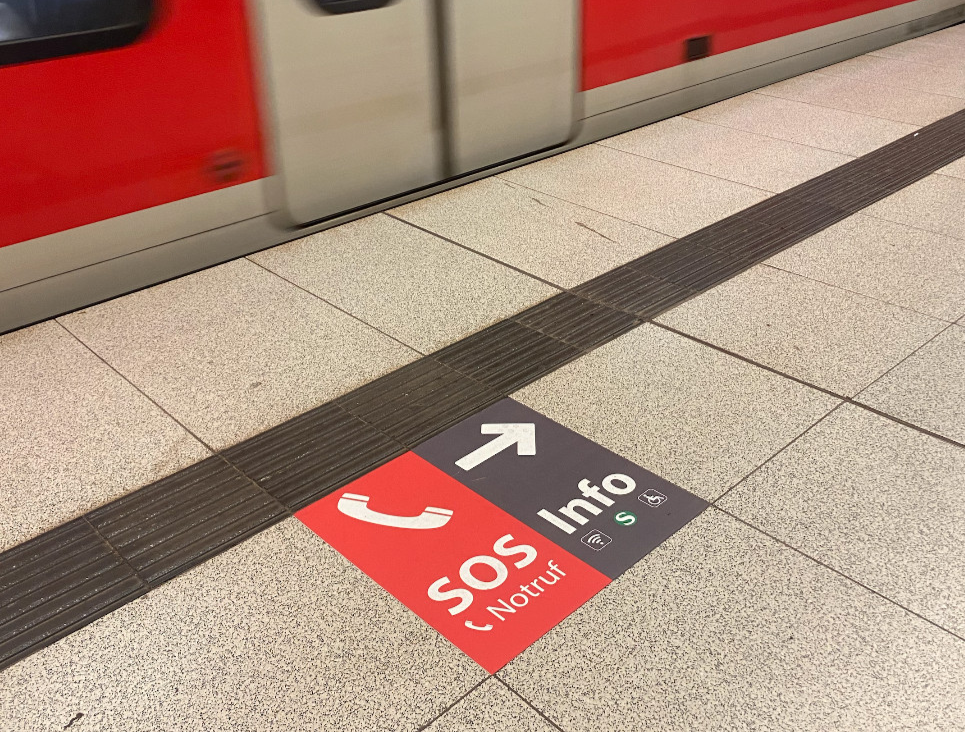 Ergänzend zur Säulenkennzeichnung wurden Bodenaufkleber zur besseren Auffindbarkeit der Notrufsäulen entwickelt. Sie erhöhen die Sichtbarkeit im Raum und leiten Fahrgäste intuitiv zur Säule. Auch diese Maßnahmen wurden prototypisch erprobt und auf Basis einer Fahrgastbefragung ausgewertet, um Orientierung und Sicherheit ganzheitlich zu verbessern.