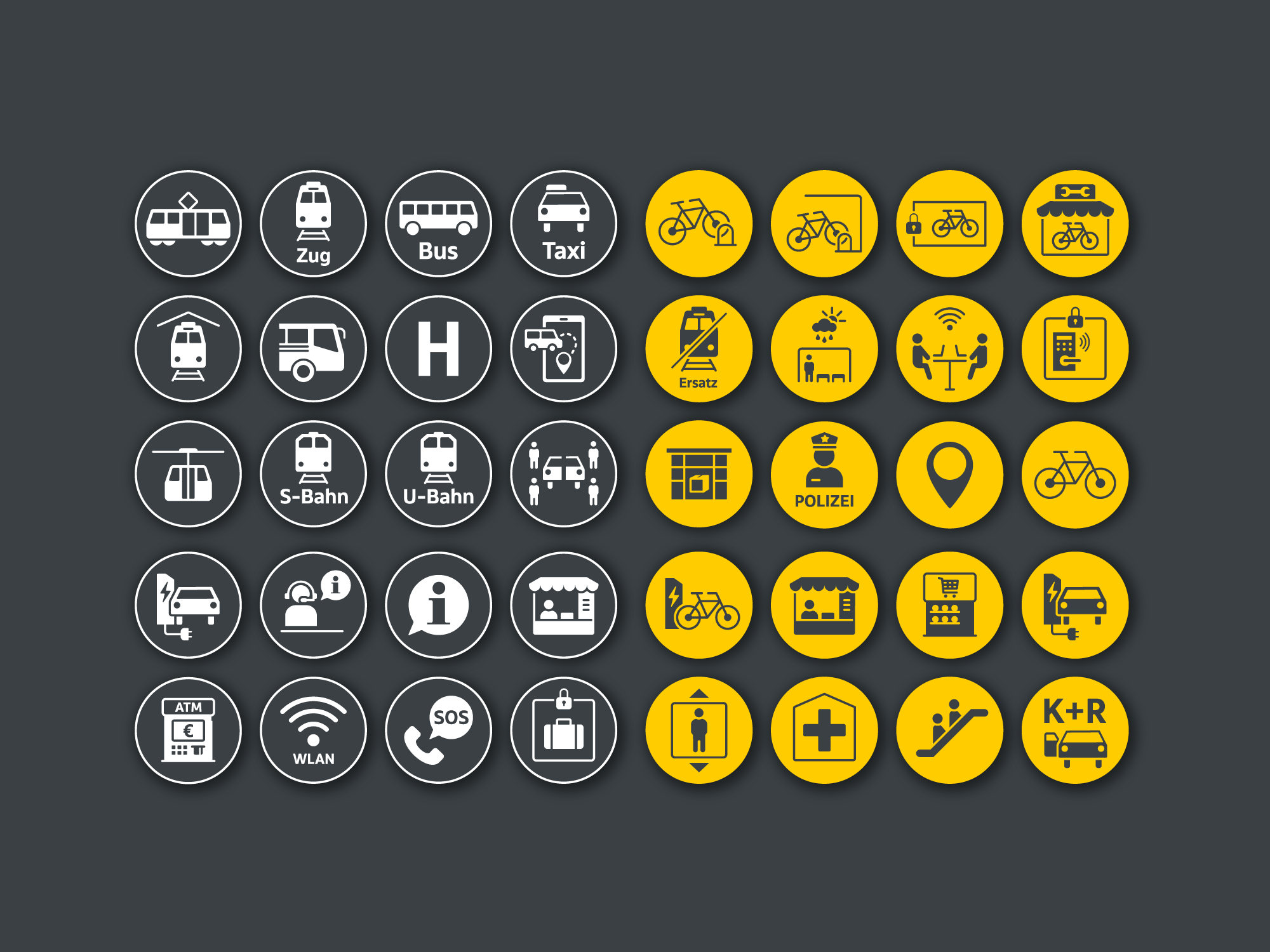 Im Zuge der Feinkonzeption wurde ein umfangreiches Piktogramm-Set in zwei Farbvarianten sowie ein eigenständiges Plandesign für Umgebungskarten entwickelt. Zusätzlich wurden konzeptionelle Besonderheiten und Individualisierungsmöglichkeiten festgehalten, mit denen die jeweiligen Kommunen ihre Mobilstationen an ihre Bedürfnisse anpassen können.