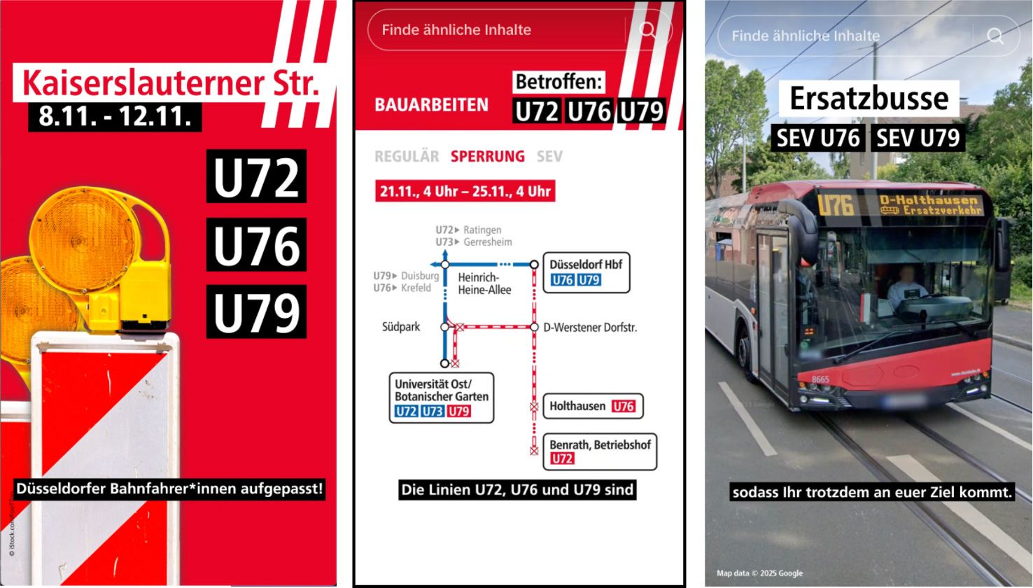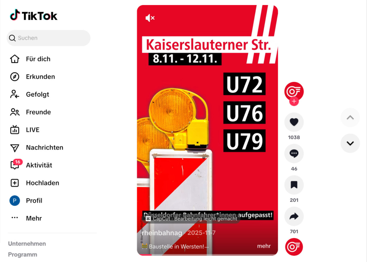 Ein wiedererkennbares TikTok-Format wurde entwickelt: klare Hook („Düsseldorfer Bahnfahrer*innen, aufgepasst!“), Voiceover und eine reduzierte Umleitungs-Visualisierung. Jede Maßnahme wird in wenigen Sekunden erklärt – so kurz wie möglich und so präzise wie nötig.